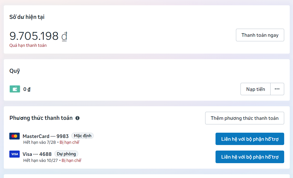 Thẻ bị hạn chế/từ chối: Nếu Facebook báo thẻ bị hạn chế, thẻ đó coi như "phế", không thể dùng cho bất kỳ tài khoản nào khác. Đừng cố bấm nạp tiền tiếp; hãy làm thẻ mới hoàn toàn và thay thế.